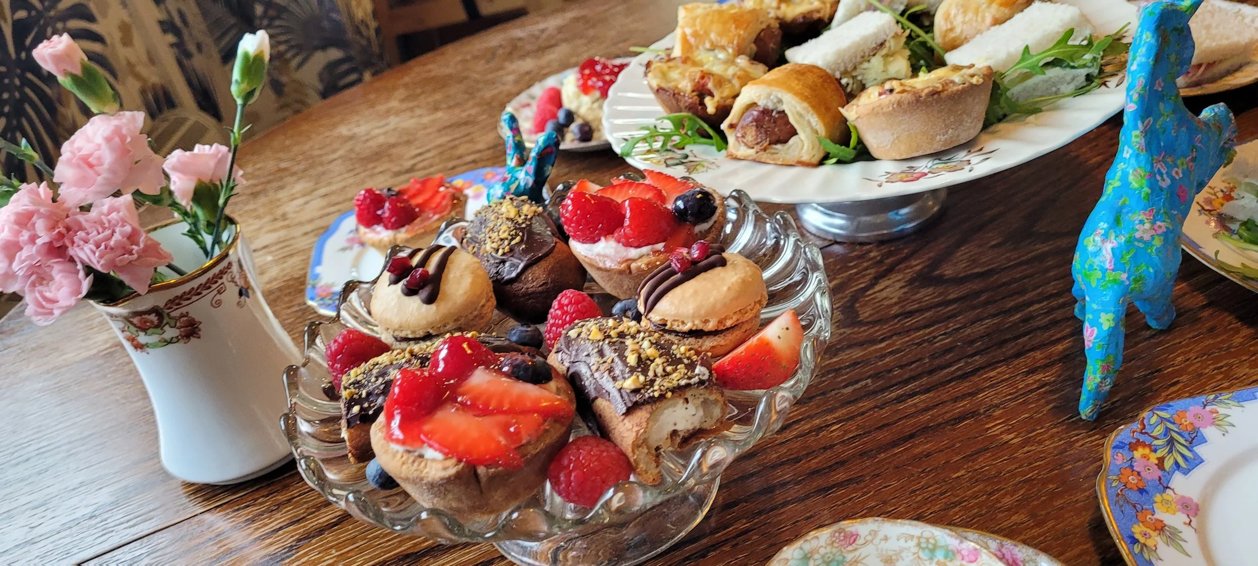 The items vary depending on availability, but they are guaranteed to come with three finger sandwiches, a cheese scone, and a sausage roll or mini quiche on the savoury tier. For the sweet tier you will be served a lemon posset or fruit tart, a chocolate fondant fancy, a macaron and a sweet scone with clotted cream and jam.